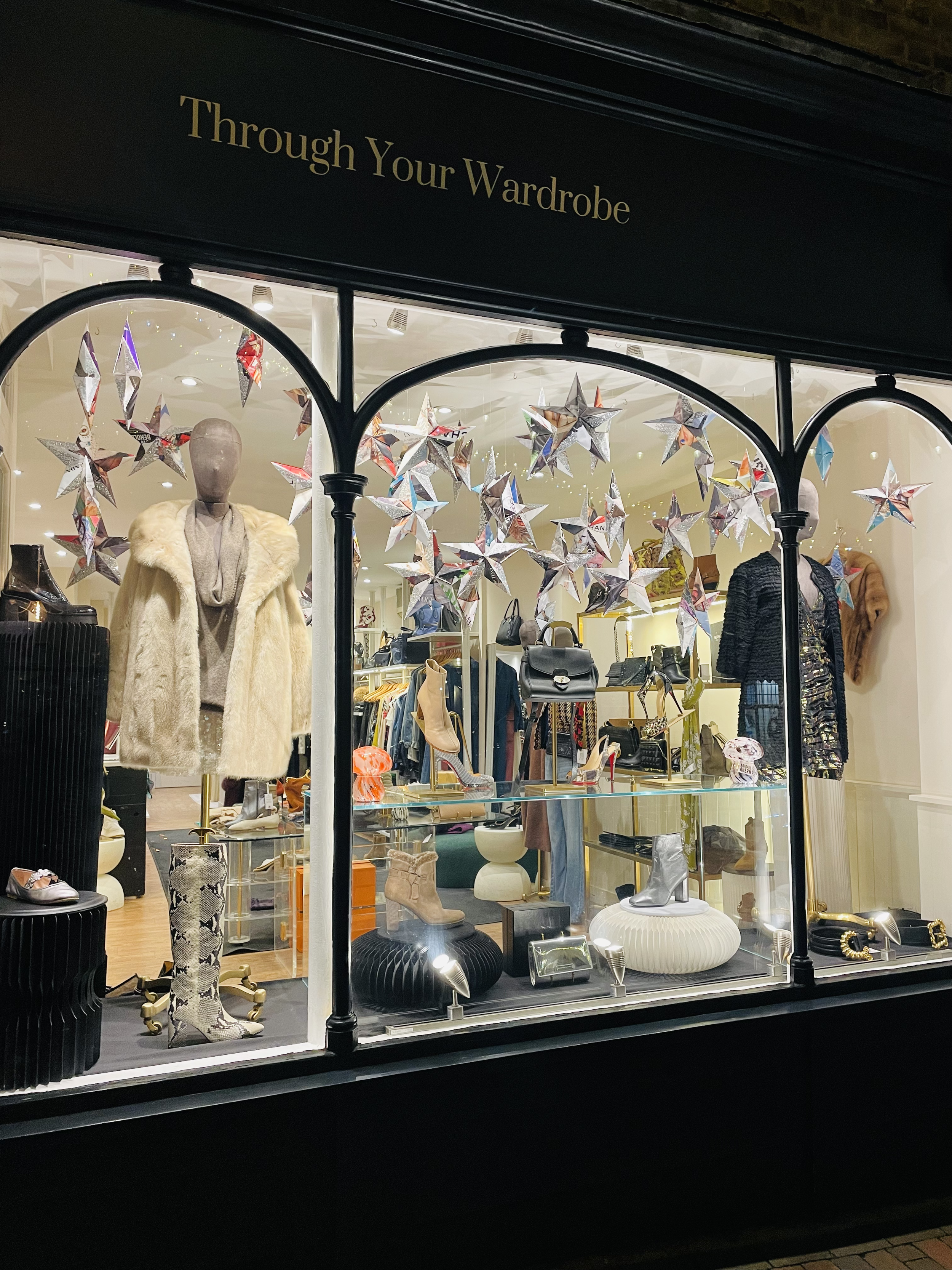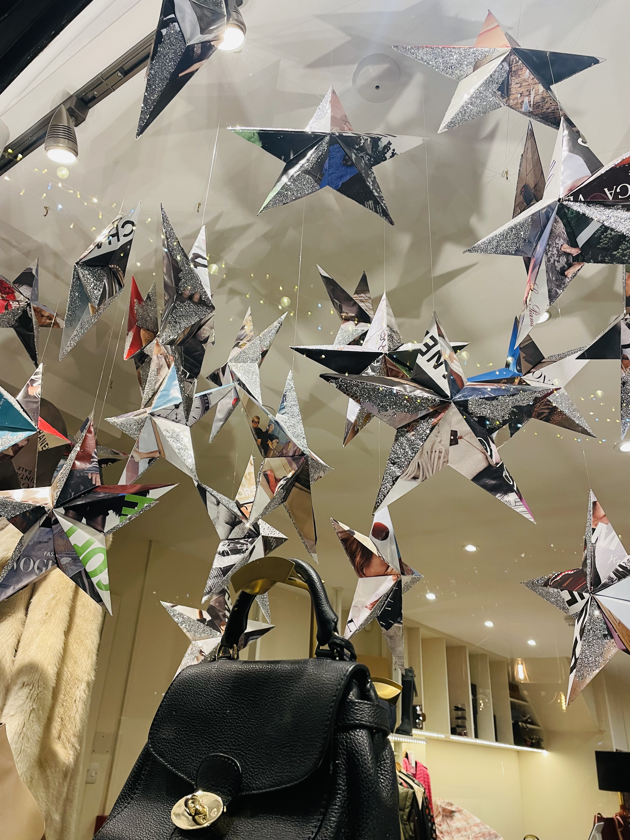 Hand crafted visual window display of origami paper stars made from pages of British Vogue. Sprinkled with Glitter.